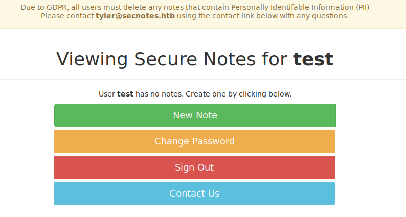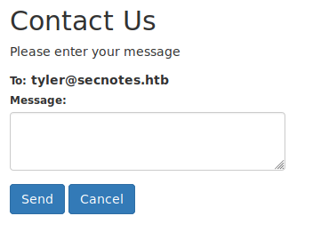 Logging in reveals a page that unveils a potential username of tyler and the domain secnotes.htb.