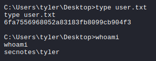 SecNotes is a Windows machine. A user registers and logs in by sending us a link through our contact form on port 80, which changes his password, granting us access to all of his notes. His notes contain his SMB credentials, allowing us to upload files to his web root folder served on port 8808. By uploading and executing webshell.php and nc.exe, we obtain a shell as Tyler. Tyler’s home directory contains an interesting bash.lnk file, indicating the presence of bash on the machine. Checking /root/.bash_history reveals the administrator credentials, which we use with psexec to gain access to an admin shell on the machine.