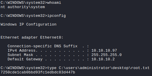 Trying to put test.txt on the share succeeds; the file uploaded can be viewed at http://10.10.10.97:8808/test.txt. From earlier, we can see that the webserver is running PHP, which can be used to execute code on the server.